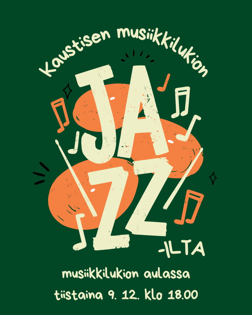 Likainen soundi, siniset sävelet, svengaava rytmi, kelluvat fraasit… Kaikkea tätä tarjoilee Kaustisen musiikkilukion Jazz -ilta tiistaina 9.12.2025 klo 18. Rasmus Tammikin kokoamassa konsertissa kuullaan mm. laulujazzia, japanilaista fuusiota, funkia sekä perinteistä jazzia usean eri kokoonpanon esittämänä. Konserttiin on vapaa pääsy. Tervetuloa!