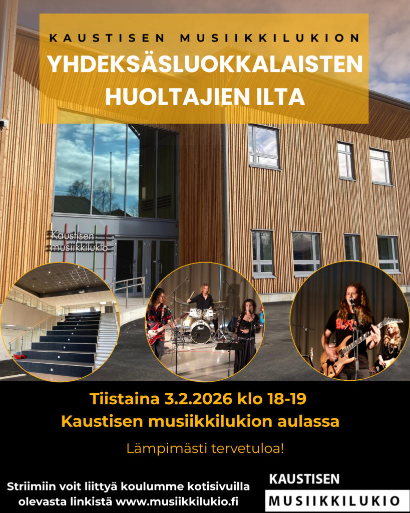 Yhdeksäsluokkalaisten huoltajille järjestetään infotilaisuus Kaustisen musiikkilukion aulassa tiistaina 3.2. 2026 klo 18-19. Tilaisuus striimataan koulumme YouTube-kanavalle, joten jos et pääse paikan päälle, on tilaisuuteen mahdollista osallistua virtuaalisesti tästä linkistä.