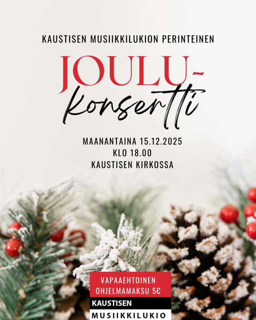 Maanantaina 15.12. klo 18 Kaustisen kirkossa kuulla musiikkilukion perinteinen joulukonsertti. Musiikkilukiolaiset esittävät sekä laulu- että instrumentaalimusiikkia, perinteisiä joululauluja sekä uudempia tuttavuuksia. Konsertti myös striimataan musiikkilukion Youtube-kanavalle ja on siellä katsottavissa ainakin vuoden loppuun saakka.